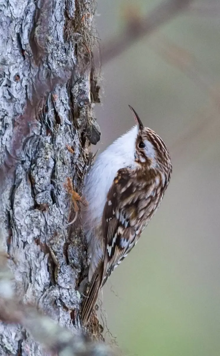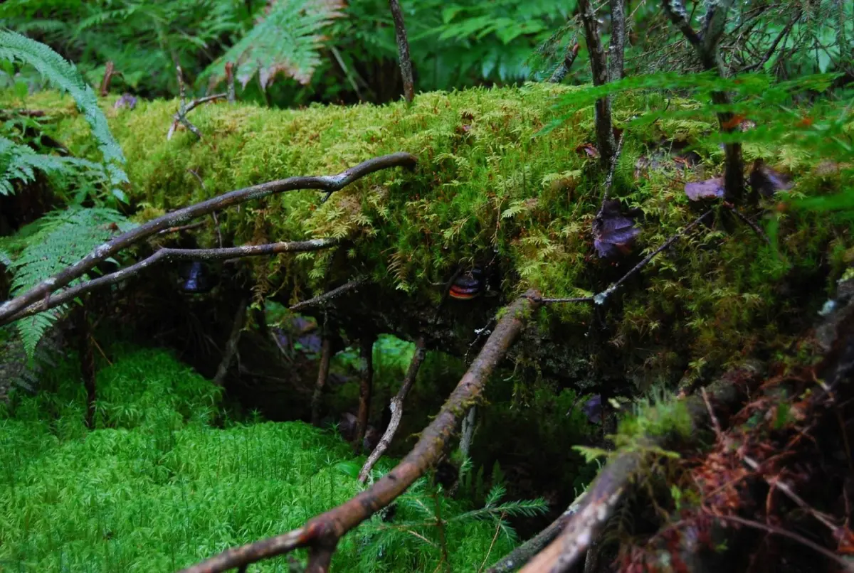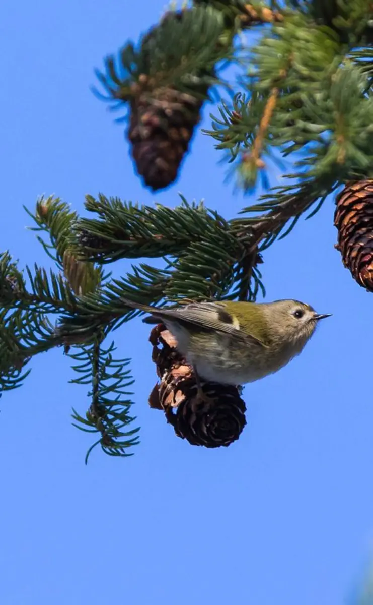 Valonsäteet siivilöityvät kuusen oksien lomitse, varvikko tuoksuu ja höyryää aamun kylmimpänä hetkenä. Hämähäkinseitteihin tiivistynyt kaste paljastaa pienten saalistajien olemassaolon joka puolella: mustikanvarvuissa, suopursujen kukinnoissa, puiden oksilla. Linnut ovat jo heränneet, puukiipijä lennähtää männyn rungolle etsien kuoren uurteista ja jäkälien röyhelöistä syötävää. Hippiäiset puuhailevat hipsutellen oksistossa ja napsivat hyppyhäntäisiä ja hämähäkkejä. Hömötiainen varoittelee ohi mennessään, viedessään poikasilleen ruokaa koivupökkelöön kovertamaansa koloon. Sillä on hieno taulakääpä terassikatoksena.